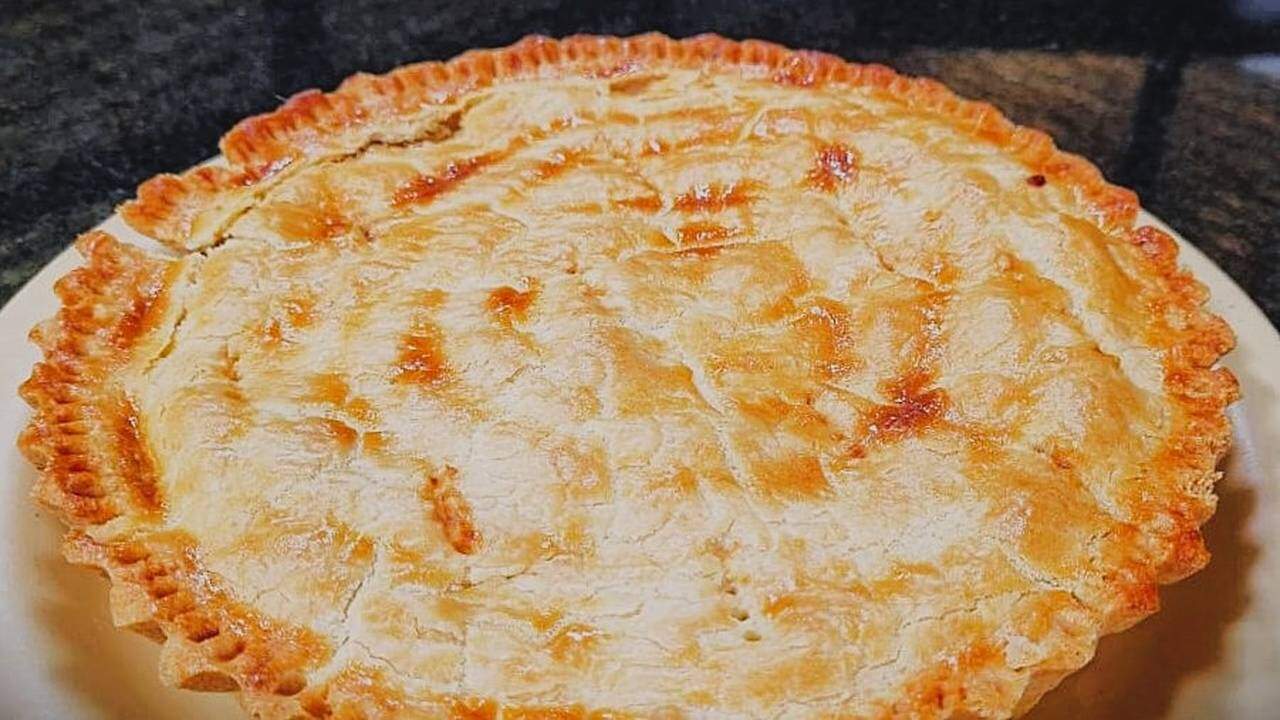 4. Coloque o recheio de frango, cubra com requeijão cremoso, use o restante da massa para tampar, faça alguns furos na massa, pincele ovo e leve para assar a 180°C por 45 minutos.