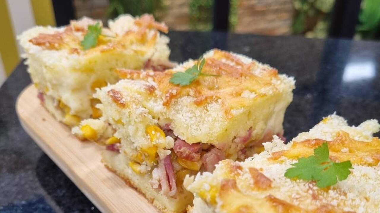 6. Espalhe metade da massa em uma assadeira untada, coloque o recheio, o requeijão cremoso, cubra com o restante da massa e finalize com a farinha panko e com o queijo meia cura.
