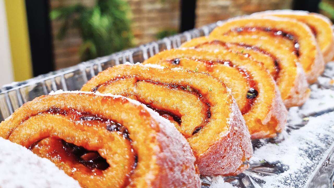5. Coloque a geléia e com a ajuda de um pano, enrole como um rocambole;