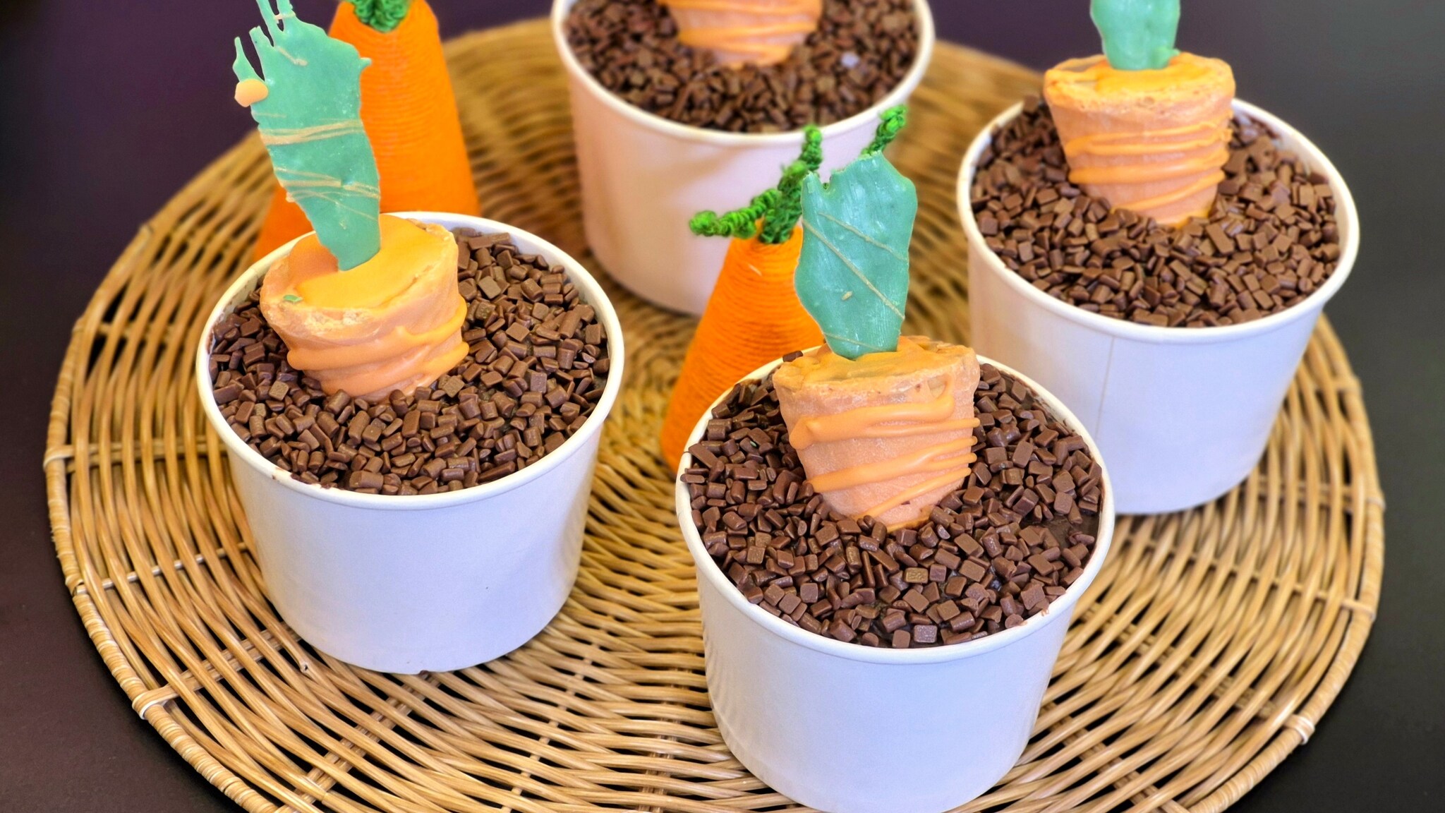 6. Coloque a cenoura, cubra com um pouco mais do chocolate laranja e fixe a folha e finalize com granulado.