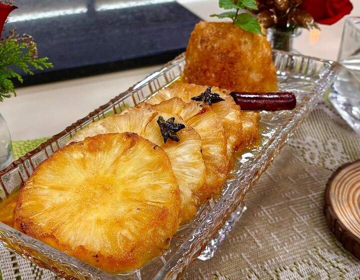 Regue o abacaxi com um pouco dessa calda e leve ao forno pré-aquecido a 190° C por 30 minutos.
