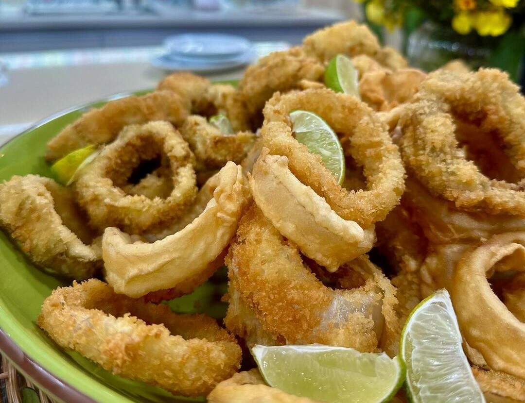 Passe os anéis de berinjela e de cebola na massinha, depois na panko e frite em óleo quente até ficar dourado.