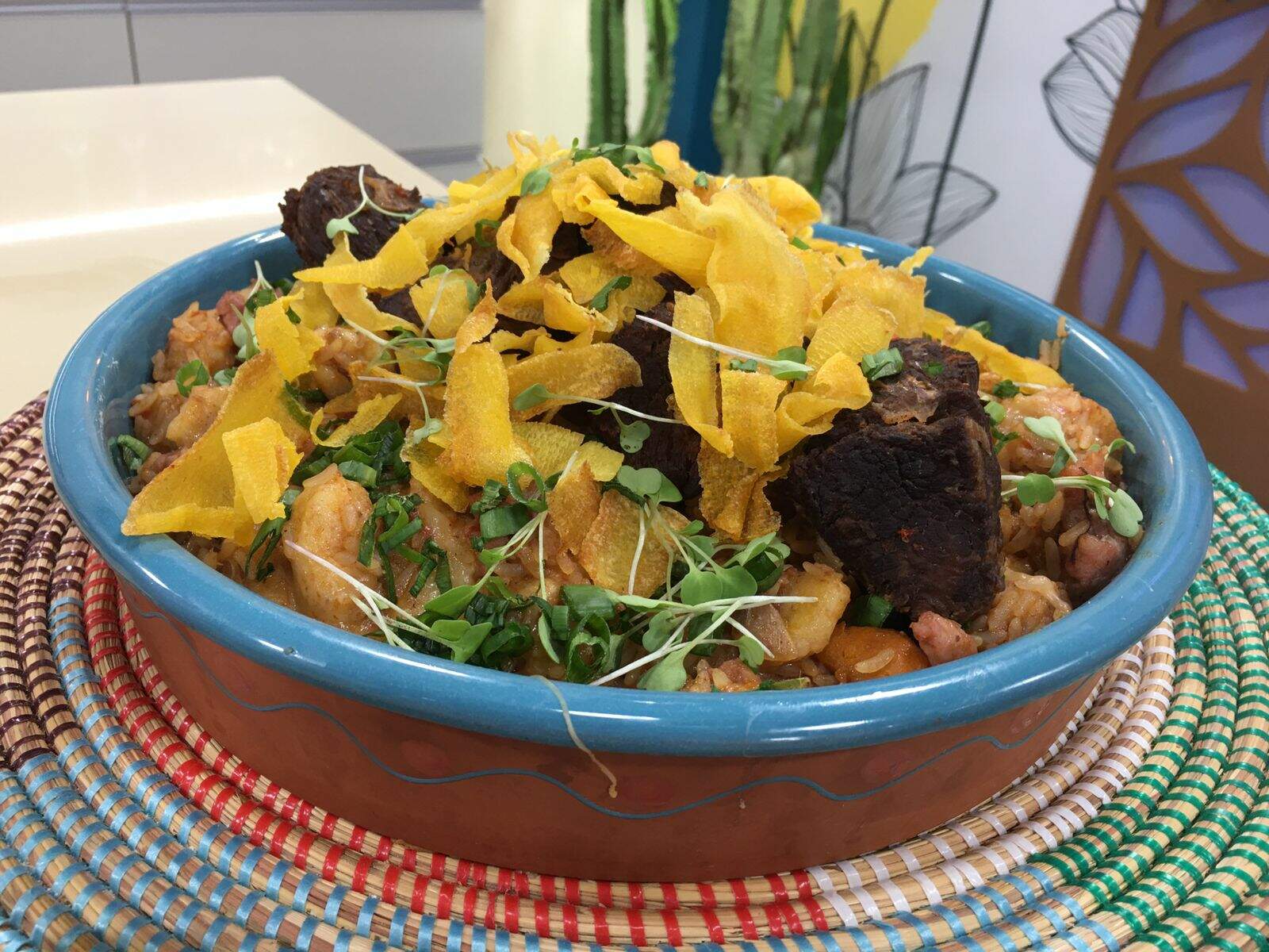 8. Sirva com a carne em cubos e o chips de mandioquinha.