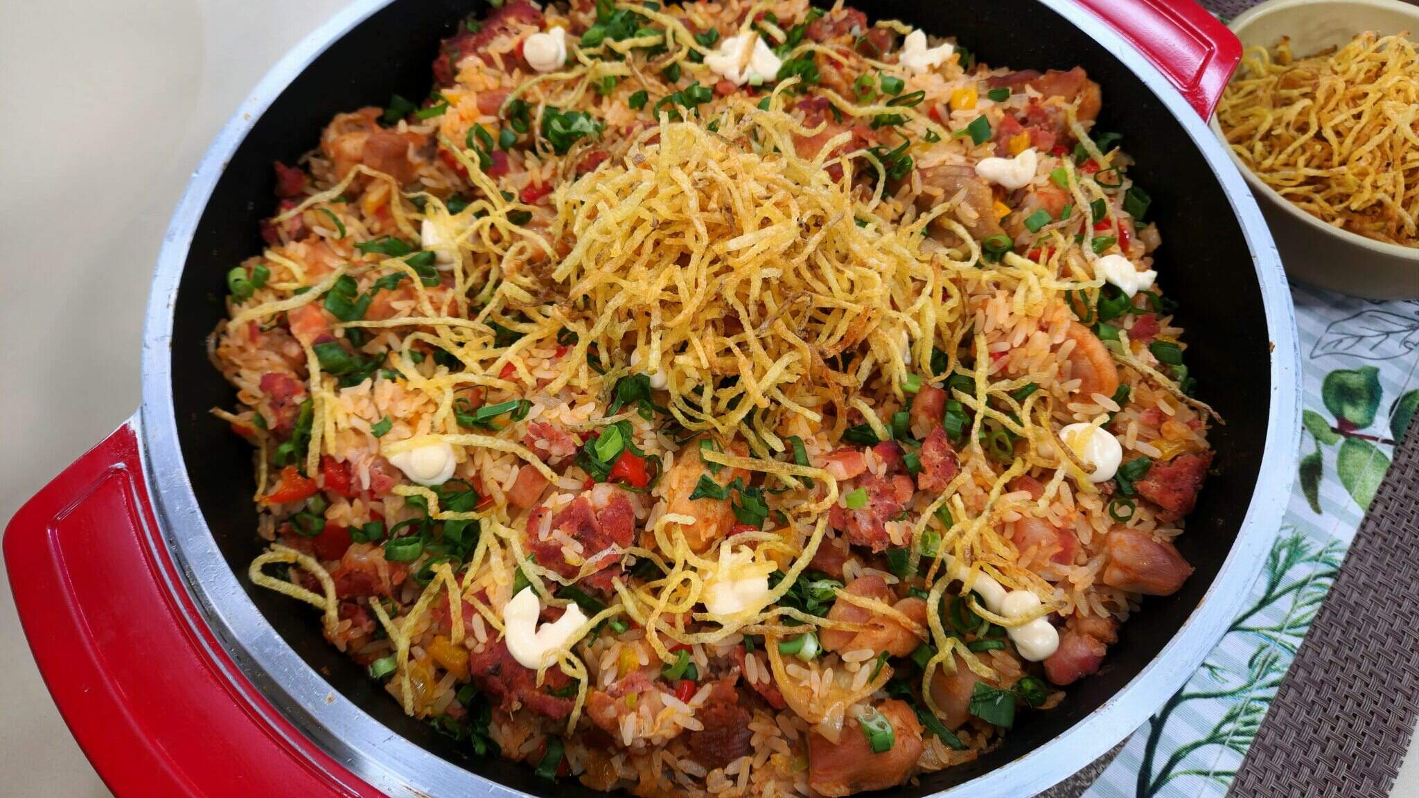 1. Tempere o frango com páprica, sal e pimenta. Em uma panela, coloque azeite, doure o frango, coloque o bacon, a linguiça e deixe dourar.