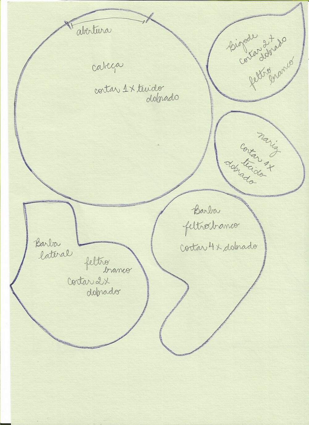 3- costure as peças já recortadas anteriormente, as mesmas podem ser feitas com auxílio de máquina de costura, costuradas à mão com pontinho caseado, e até mesmo coladas, lembrando que antes de fechar totalmente o rostinho, o nariz, o gorro e o pompom do gorro (faça fuxico cheio), encher com plumante e então, feche por completo.
