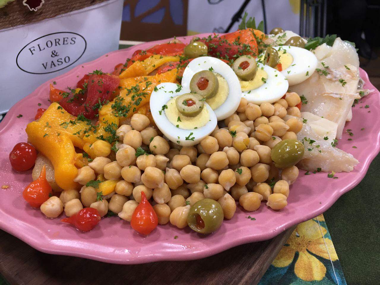 Dessalgue o bacalhau. Cozinhe o bacalhau e reserve. Com a água do cozimento do bacalhau cozinhe o grão de bico e as batatas, reserve. Em um refratário adicione azeite, arrume o bacalhau e os legumes. Finalize com ovos e azeitonas. Leve ao forno a 160 graus. Finalize com cheiro verde e sirva com arroz branco.