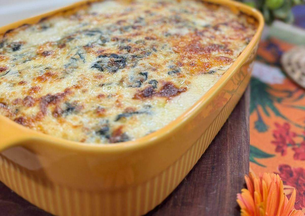 1. Em uma frigideira, coloque azeite, doure o alho, os talos brancos da cebolinha, o alho-poró e a cebola, coloque o espinafre, deixe secar bem e reserve.