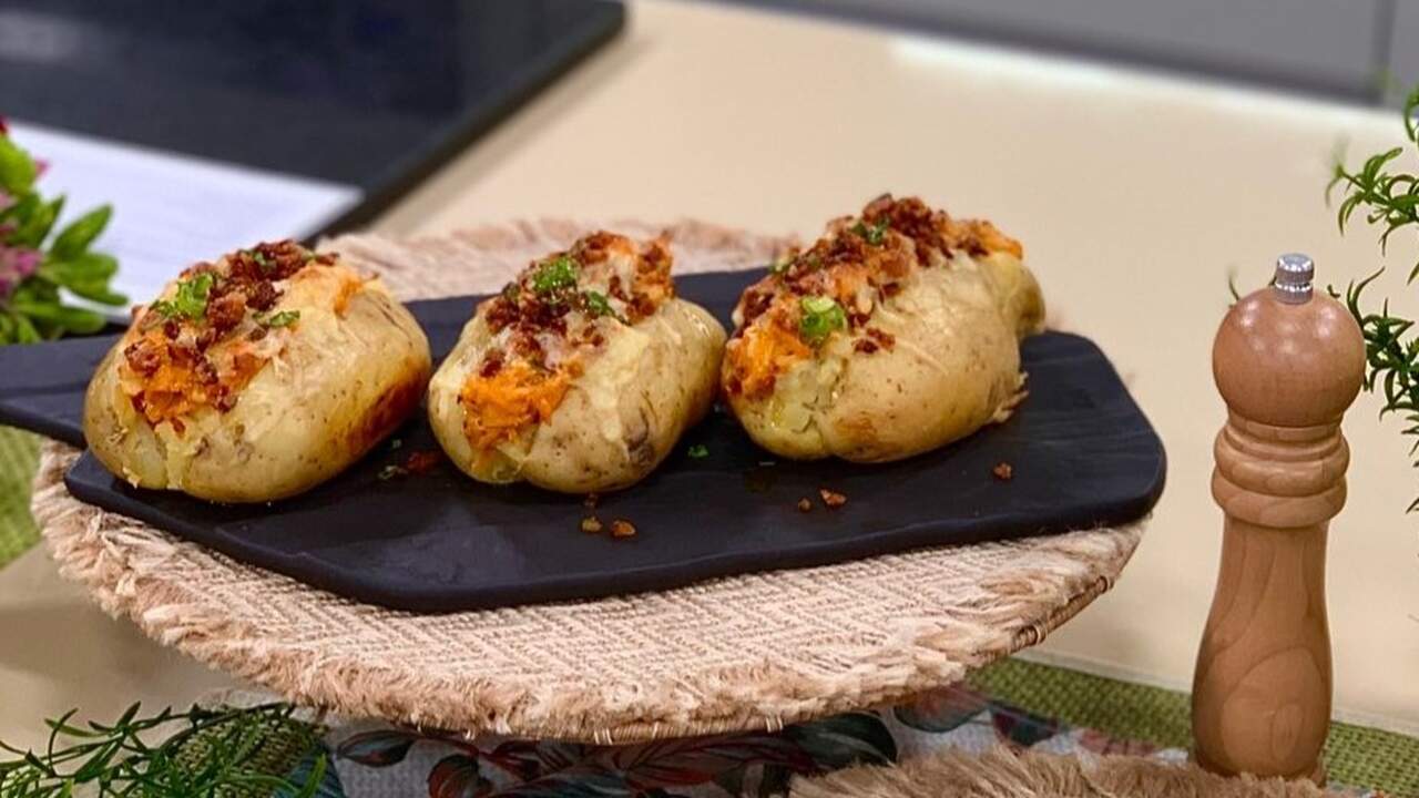 2. Use o frango para rechear a batata finalize com bacon e muçarela. Leve para gratinar.