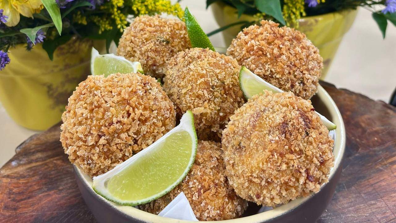 6 - Coloque numa assadeira, deixe descansar na geladeira por pelo menos 1 hora, faça bolinhas e empane com clara de ovo e farinha panko. Frite ou leve para assar.