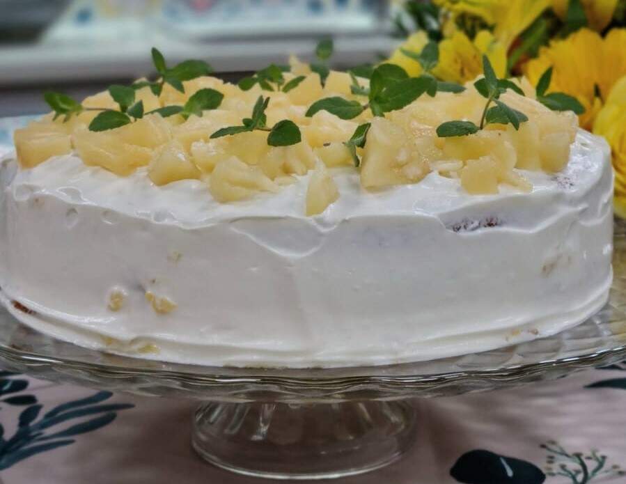 3. Use o restante da calda para cobrir o bolo e o restante do abacaxi.