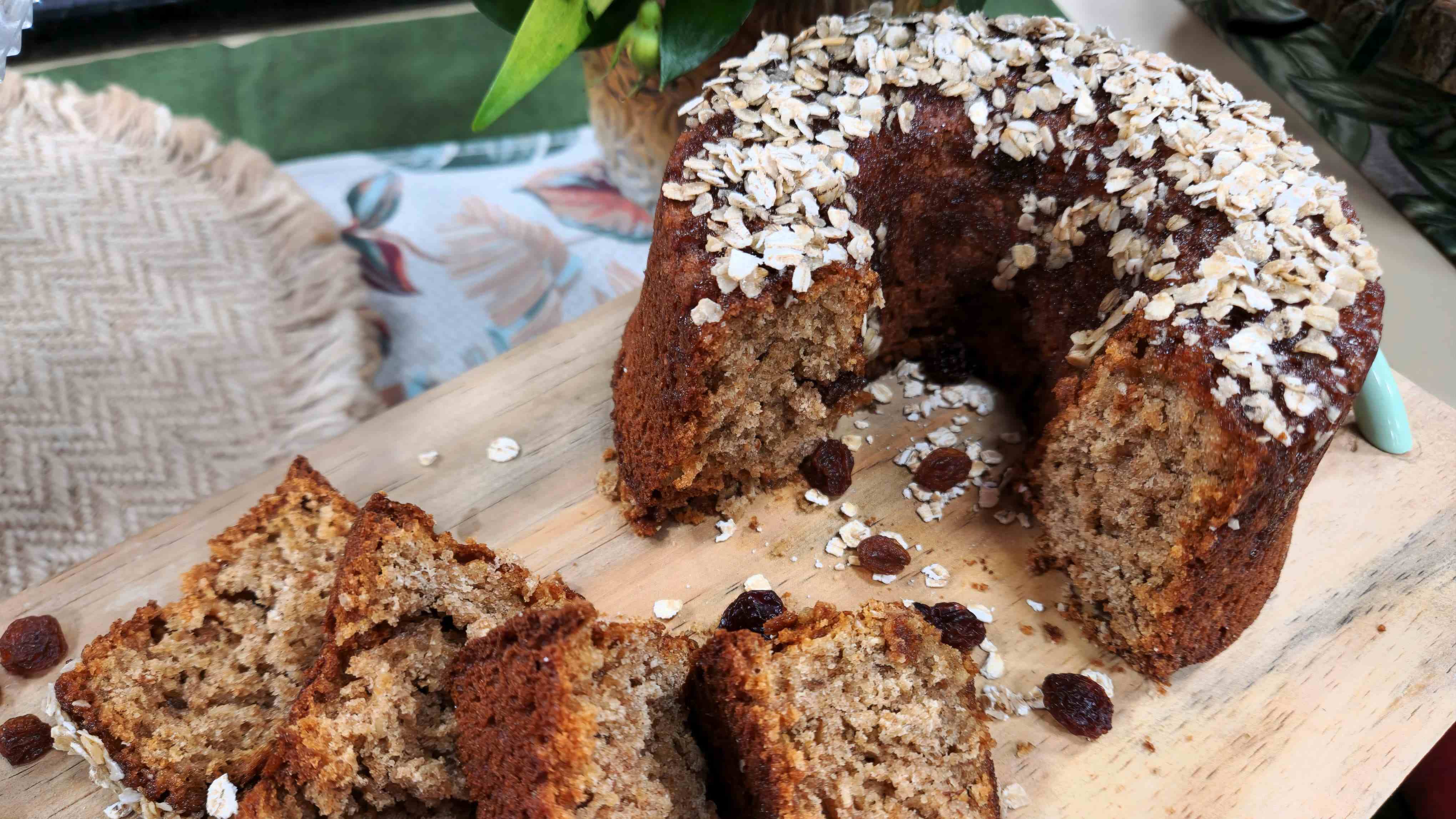 5. Depois de assado, jogue mel por cima do bolo e salpique aveia.