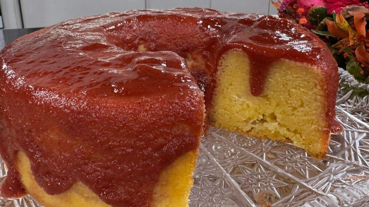 2 - Desligue, deixe amornar e espalhe sobre o bolo. Corte em pedaços e sirva em seguida.
