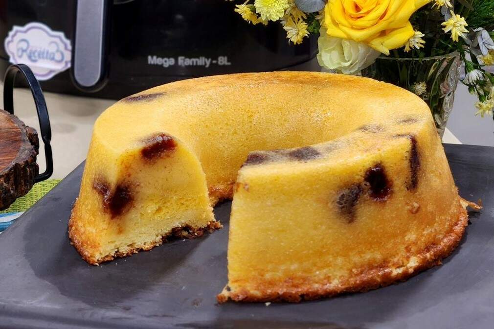 5. Despejar a massa, colocar os cubos de goiabada empanados e levar na ayr fryer pré-aquecida a 180°C por aproximadamente 30 a 35 minutos até corar.