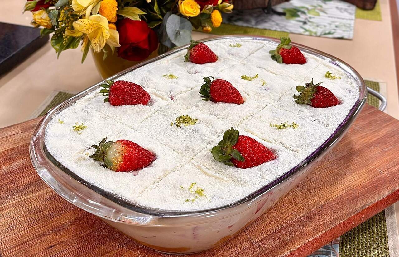 Coloque o bolo em uma travessa, coloque toda a calda, o creme de confeiteiro com morangos picados e leve para gelar.