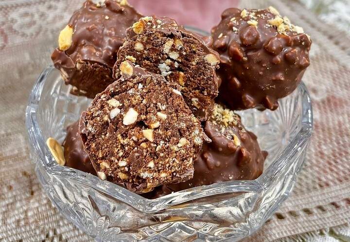 Derreta o chocolate e misture com o amendoim triturado. Cubra as bolinhas e deixe secar.