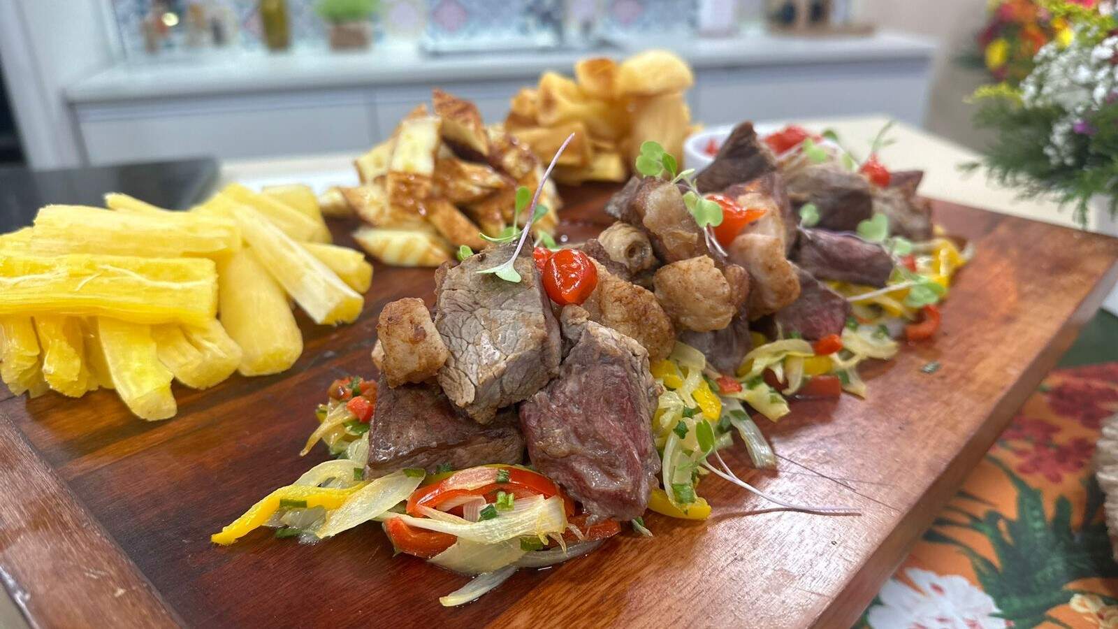 Em uma tábua ou refratário, coloque o refogado, a mandioca cozida ou frita, e jogue melaço por cima do queijo coalho e sirva.
