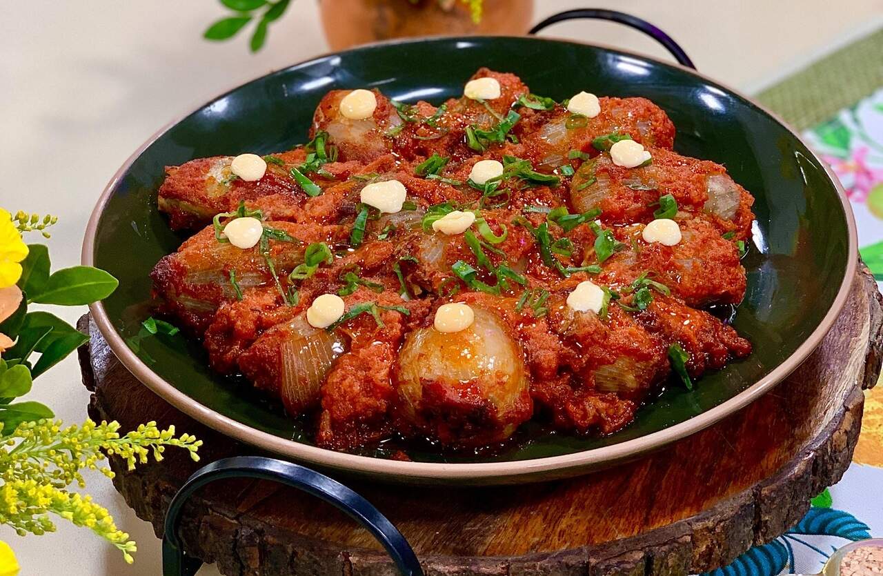 5. Coloque a mistura da carne nas pétalas de cebola e enrole.