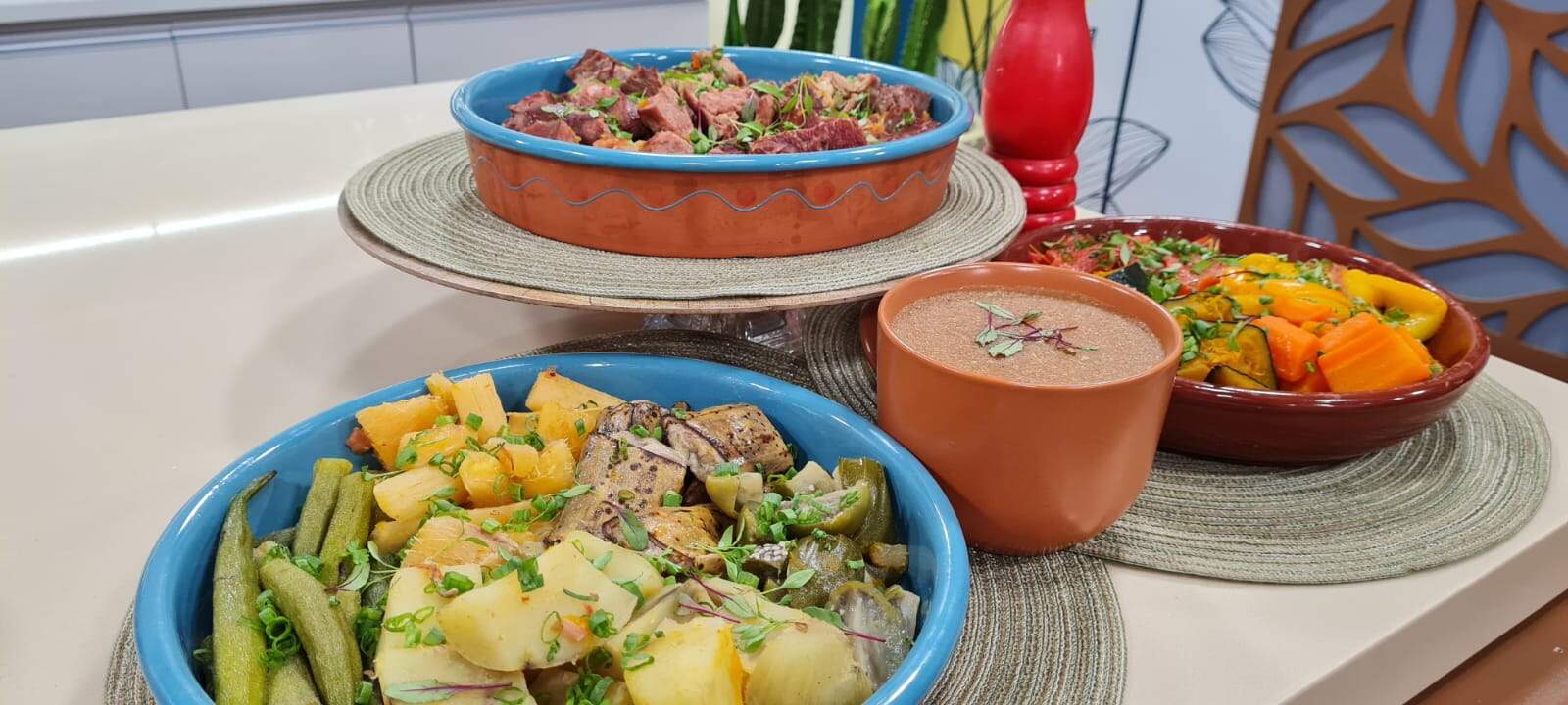 6. Coloque os pimentões, a batata doce, o quiabo e o jiló, cozinhe por mais 5 minutos.