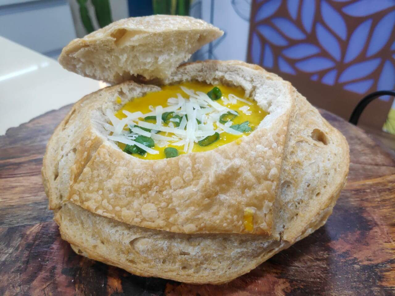 4. Abra uma tampa no pão italiano e retire o miolo, coloque a sopa no pão e a cebolinha