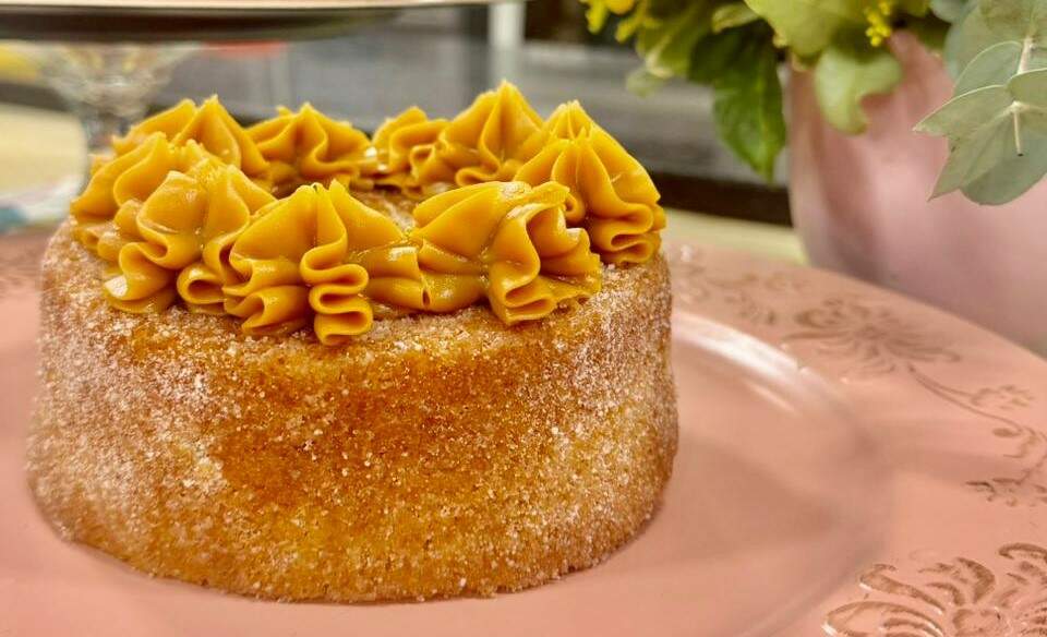 Após o bolo frio, pincele a manteiga derretida e leve ao micro-ondas por 30 segundos, retire polvilhe açúcar, canela e cubra com doce de leite.