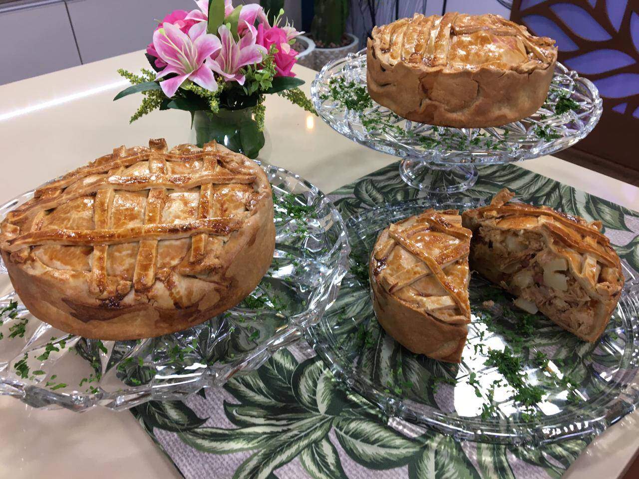 Modo de preparo do Recheio: Em uma panela coloque o azeite, doure o alho e a cebola, acrescente a linguiça, junte o frango e o pernil e o sal. Adicione os demais ingredientes (exceto o queijo) e misture bem e reserve. Divida a massa em três partes (uma para a tampa e duas para a base), com a ajuda de um rolo de massa abra a massa para a base e forre uma forma de fundo removível (forma de 15 cm), recheie intercalando o recheio reservado com pedaços de queijo, cubra com o restante da massa (formando a tampa). Faça algumas tiras com a outra parte da massa para decorar, pincele com o ovo ligeiramente batido e leve ao forno pré-aquecido até dourar.