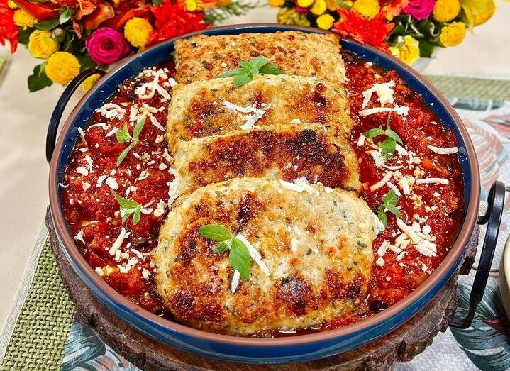 3. Coloque a farinha de rosca e o parmesão, finalize com cebolinha.