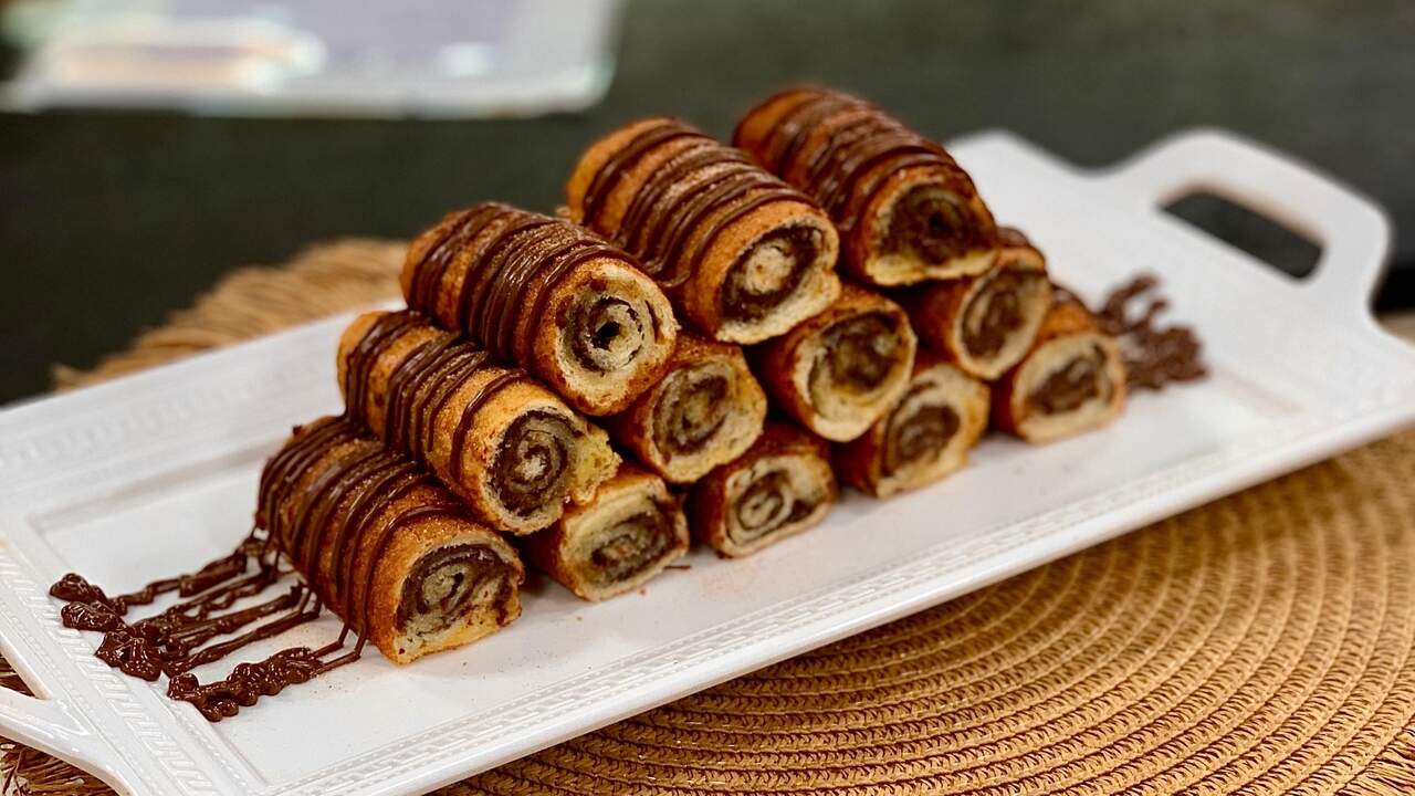2. Passe o creme de avelã e enrole igual a um rocambole.