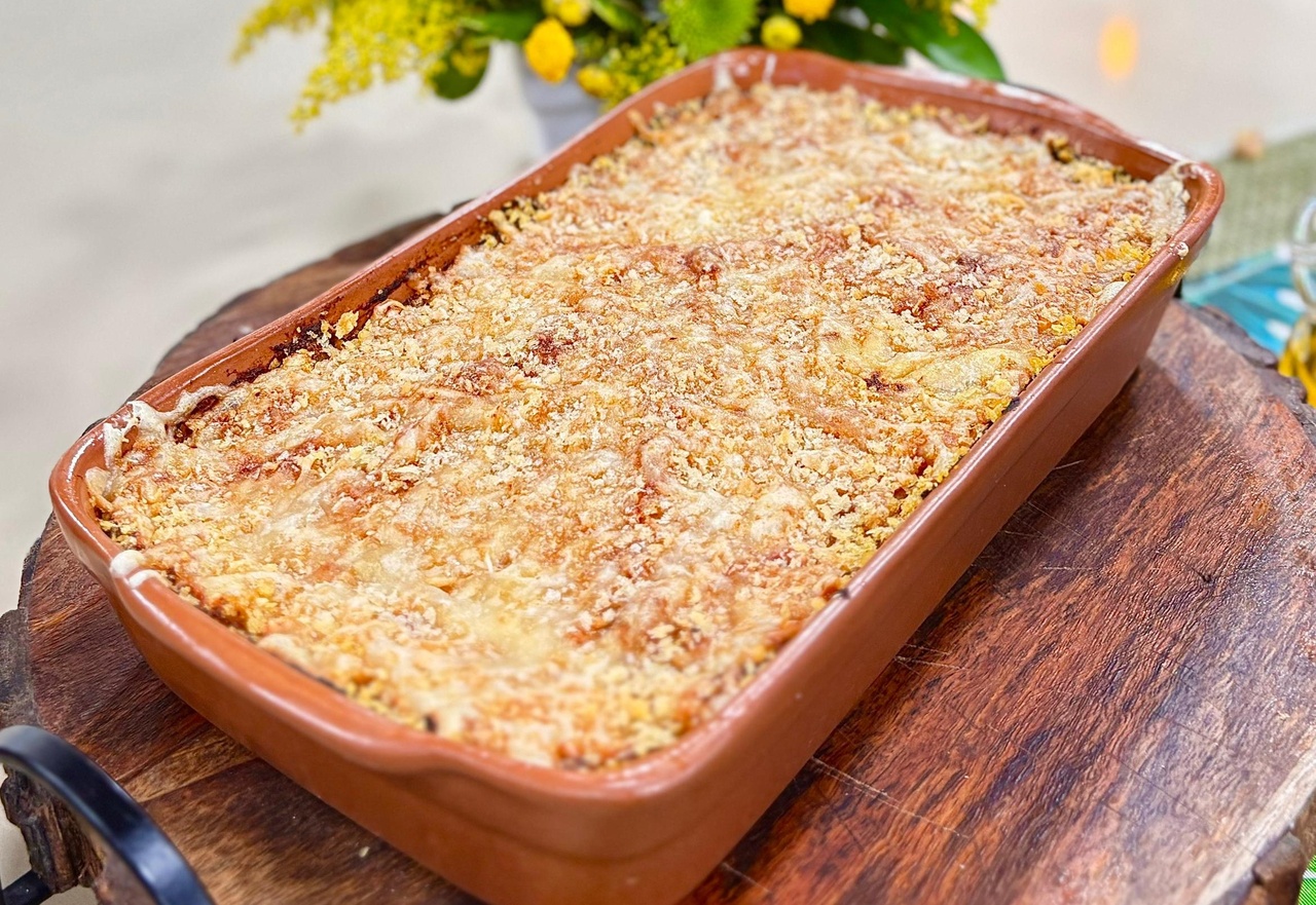 Coloque em uma travessa. Cubra com um purê de abóbora, mussarela e a farinha Panco, leve para assar 180 graus por 45 minutos.