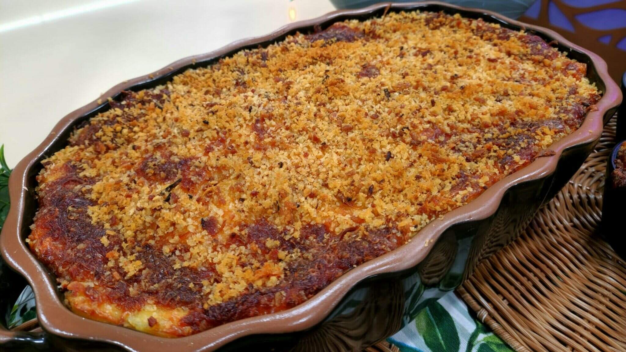 Em uma travessa, coloque a carne, cubra com o purê, polvilhe o restante do queijo, coloque a farofa de bacon e leve para gratinar ao forno à 180º por 30 min. Sirva