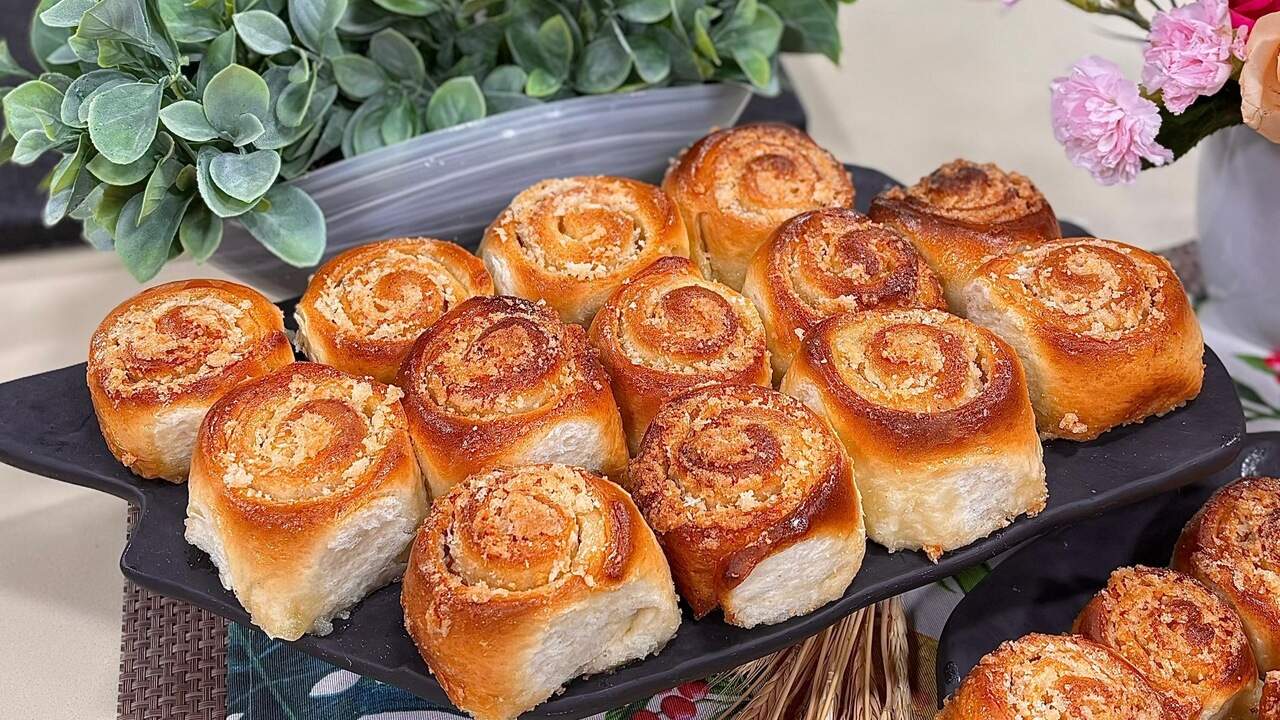 4 - Abra a massa em retângulo espalho o recheio enrole e corte rodelas de mais ou -3 dedos de espessura;