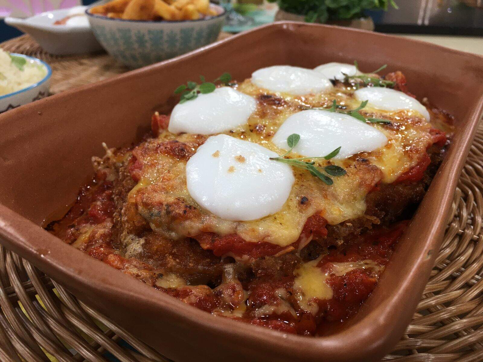 4. Colocar em uma assadeira um pouco de molho e tomate no fundo, por cima os bifes fritos e acrescentar mais molho por cima dos bifes e a muçarela.