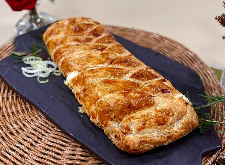 Abra a massa folhada no formato de um retângulo que caiba um pedaço de salmão.