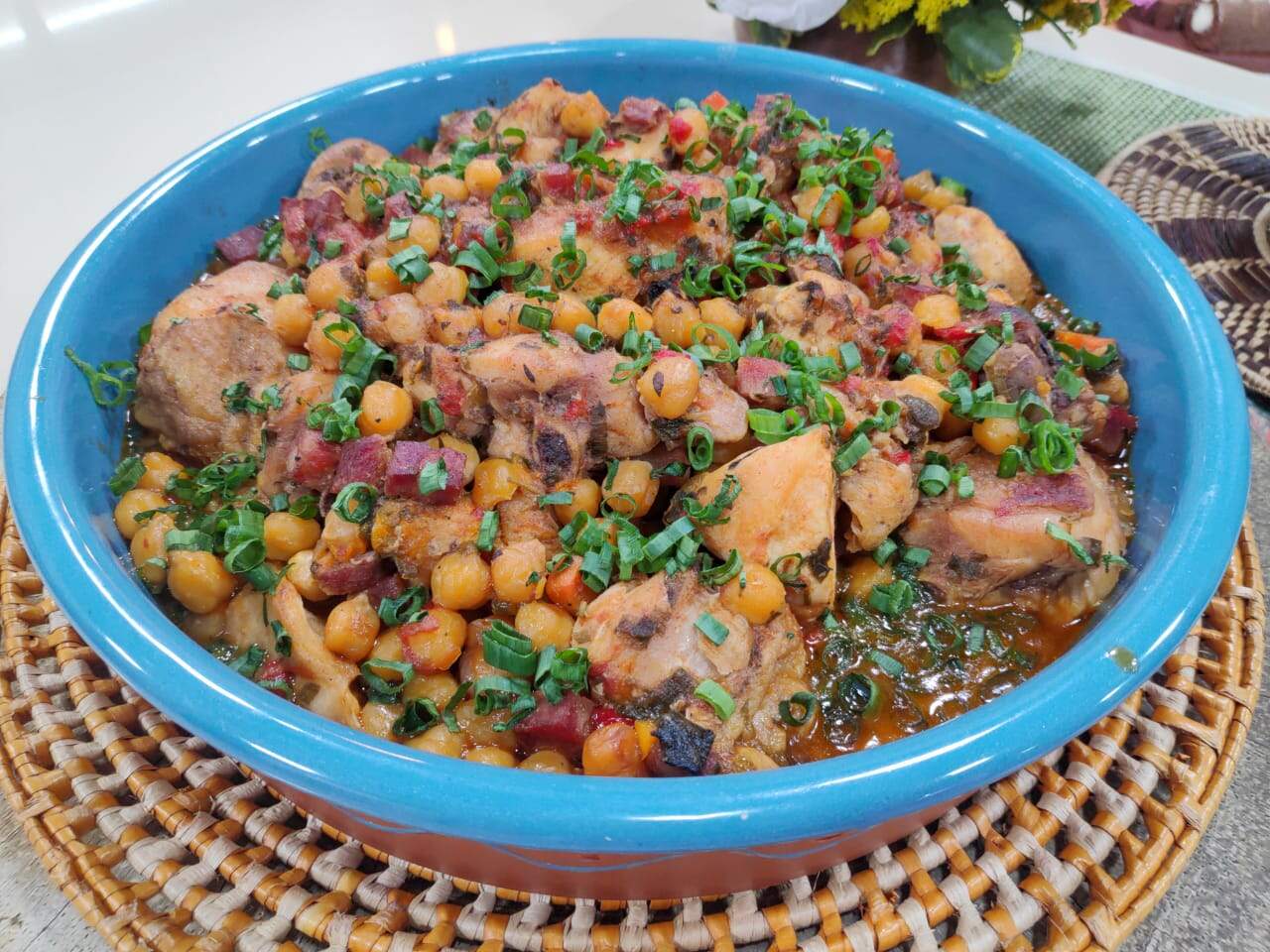 4. Misture o tomate pelado, o grão de bico e o caldo, ajuste o sal e deixe cozinhar em fogo baixo até ficar macio.