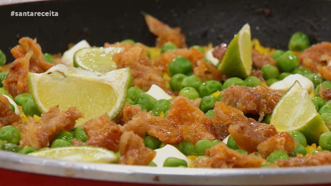 6 - Finalize com as ervilhas, a cebolinha verde e a pele do frango assada.