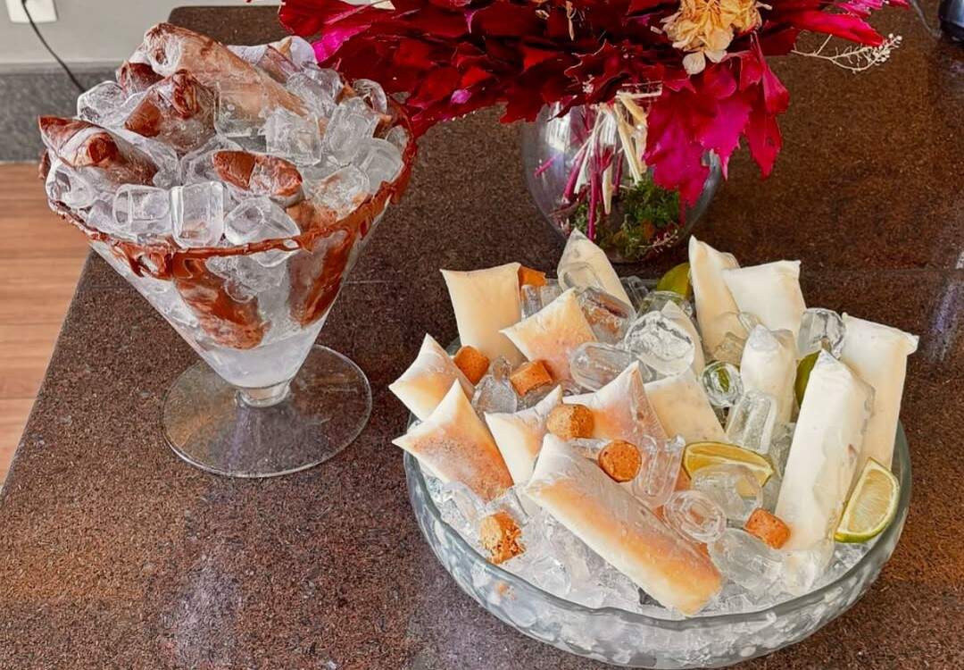 Colocar um pouco de bolachas no saquinho e quebrar. Misturar o suco com a base e colocar com a ajuda de um funil nos saquinhos com a bolacha já dentro. Sacudir levemente para que se misture ao creme. Deixar em congelador por no mínimo 4 horas.