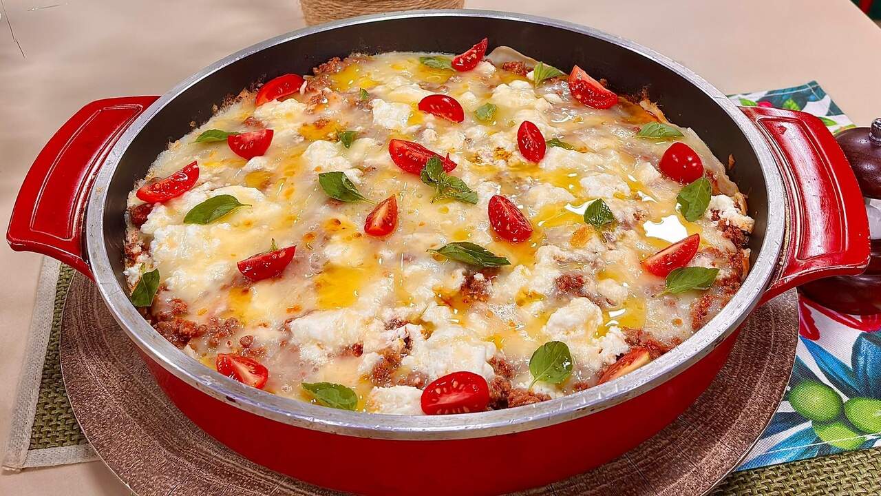 1. Em uma frigideira grande coloque um pouco do molho, uma camada de massa fresca, um pouco mais de molho, o requeijão cremoso, o presunto e a muçarela. Repita finalizando com molho e muçarela.