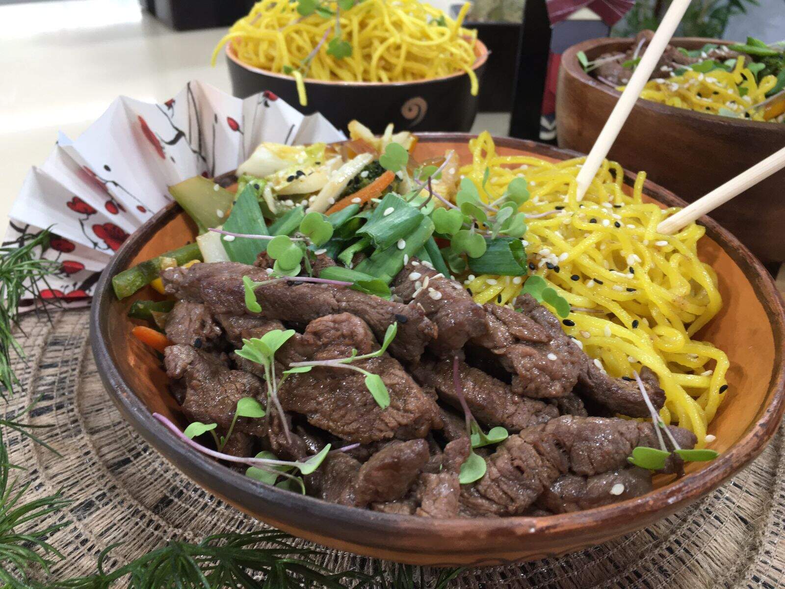 Finalizar com salsa, cebolinha, óleo de gergelim e gergelim.