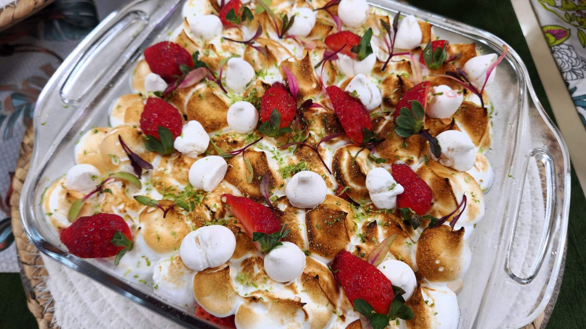 No refratário coloque o suspiro no fundo, os morangos picados, cubra com o merengue, repita o processo e finalize com morangos, toste com o maçarico ou forno se quiser.