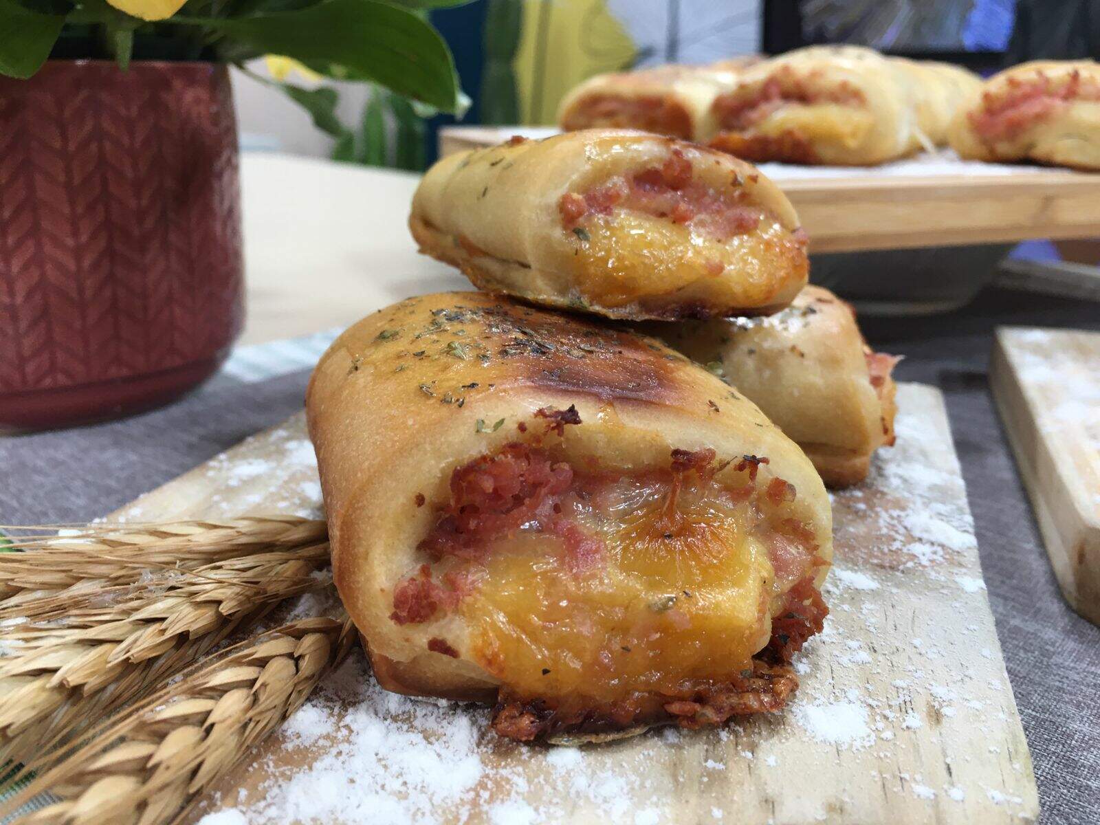 4. Com a ajuda de um rolo, abra a massa retangular, coloque presunto e o queijo, feche como uma carteira.