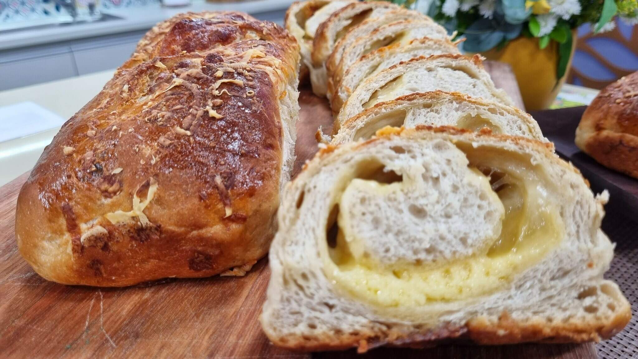 3. Depois desse período, abra a massa em retângulos, espalhe a muçarela e feche como se fosse um rocambole.