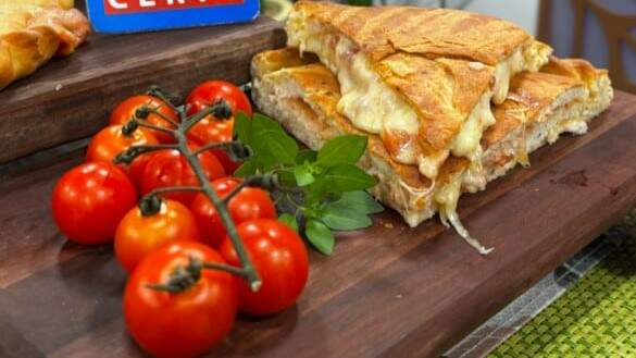 4. Divida a massa em dois discos. Coloque azeite em uma assadeira e cubra com um disco. Coloque molho de tomate, muçarela, cebola, tomate picado e cubra com o outro disco.