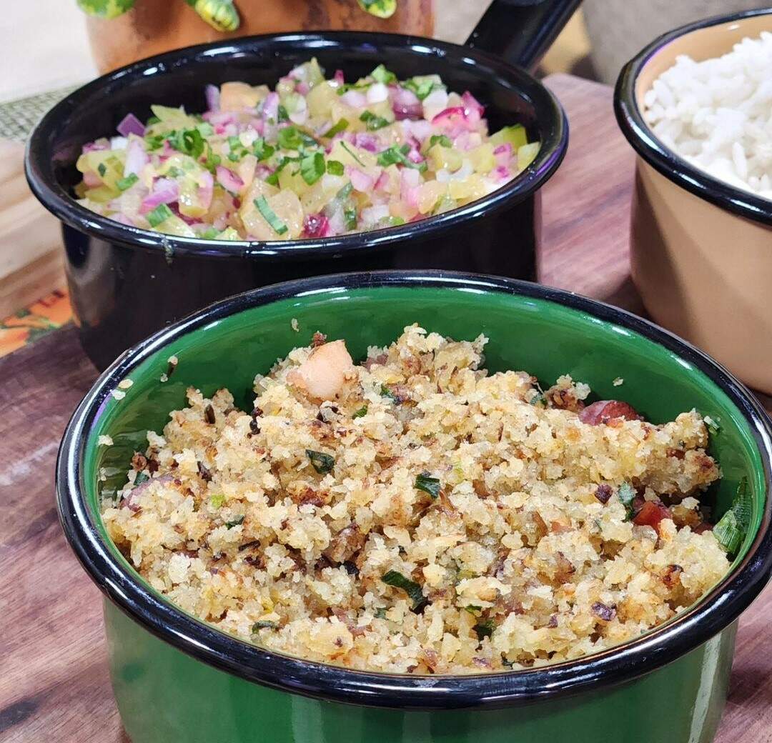 Sirva com a salada de tomate verde, farofa de banana e cebola agridoce.