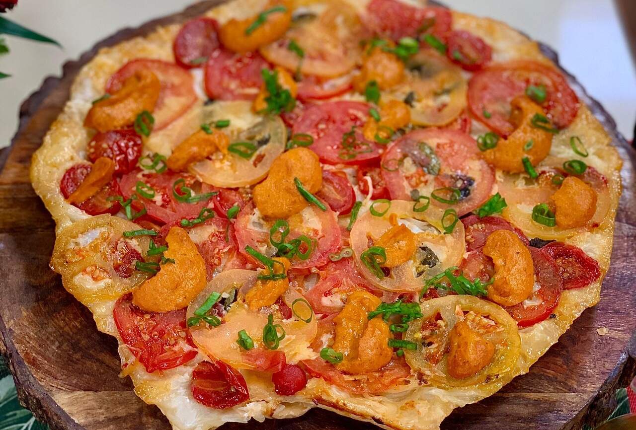 1. Corte o tomate cereja ao meio e fatie os tomates de forma bem fina. Reserve.