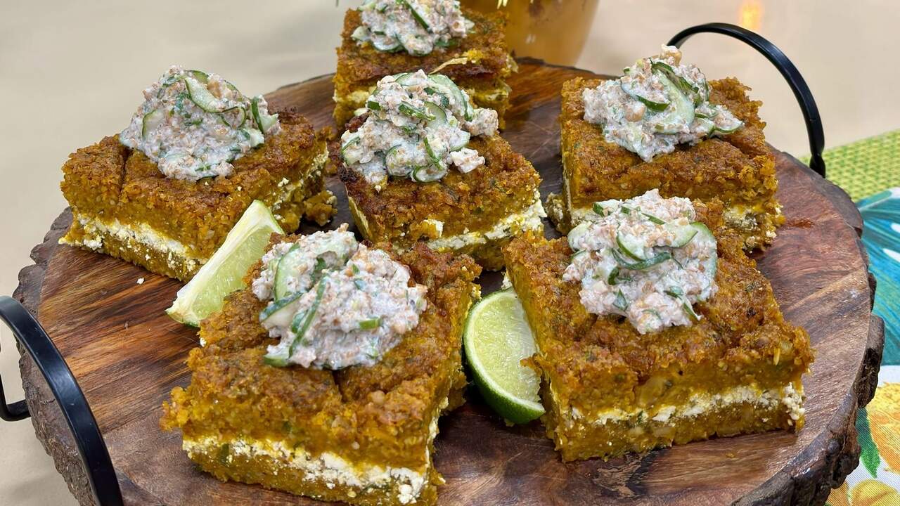 6 - Em uma assadeira coloque uma camada do quibe, recheio com a ricota e cubra com o restante da preparação. Leve para assar a 180° por aproximadamente 40 minutos.