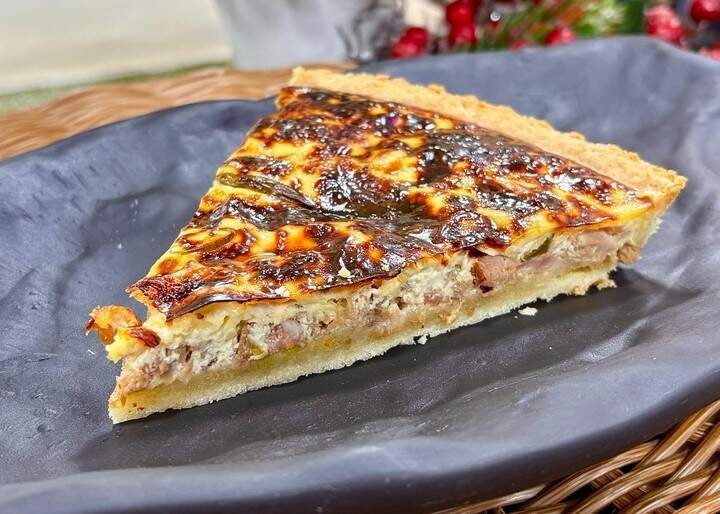 2. Misture com atum sólido e finalize com cebolinha. Coloque na massa do quiche e cubra com o creme.