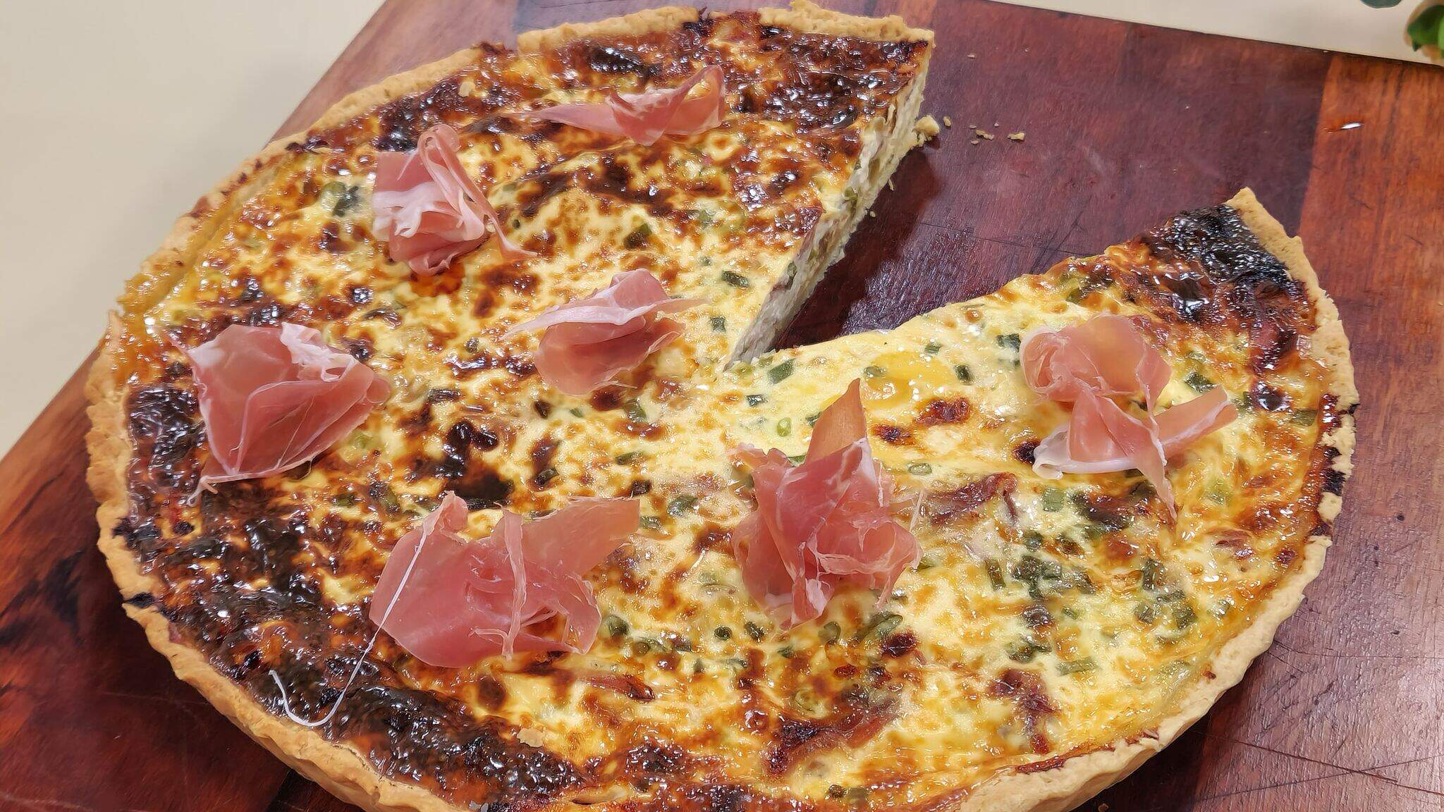 No de figo com parma, colocar a cebola dourada sobre a massa, o parma picado e despejar o creme por cima.