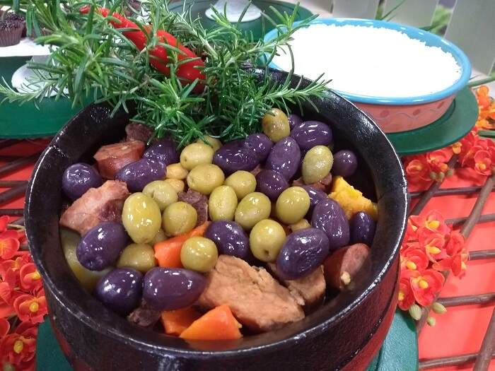 3. Juntar o restante dos ingredientes menos o repolho e as azeitonas, deixar cozinhar por uns 30 minutos, juntar o repolho e ferver por 3 minutos, servir com arroz branco.