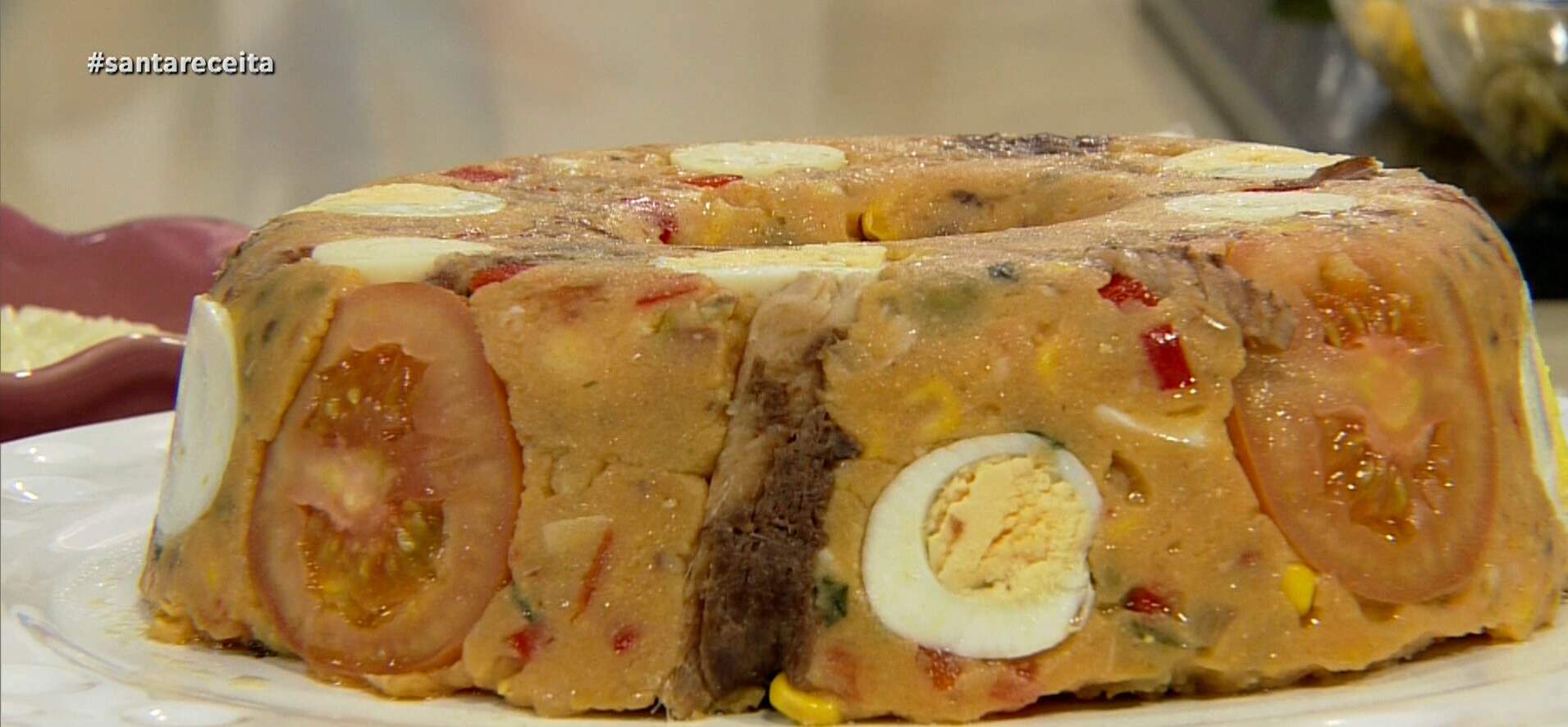 Montagem: em uma fôrma de cone central (22,5 x 9 cm) untada com azeite, distribua as rodelas de ovo e tomate, a sardinha restante e as tirinhas de pimentão de forma decorativa. Despeje a massa do cuscuz e alise a superfície. Aguarde 10 minutos para desenformar e sirva em seguida ou em temperatura ambiente.