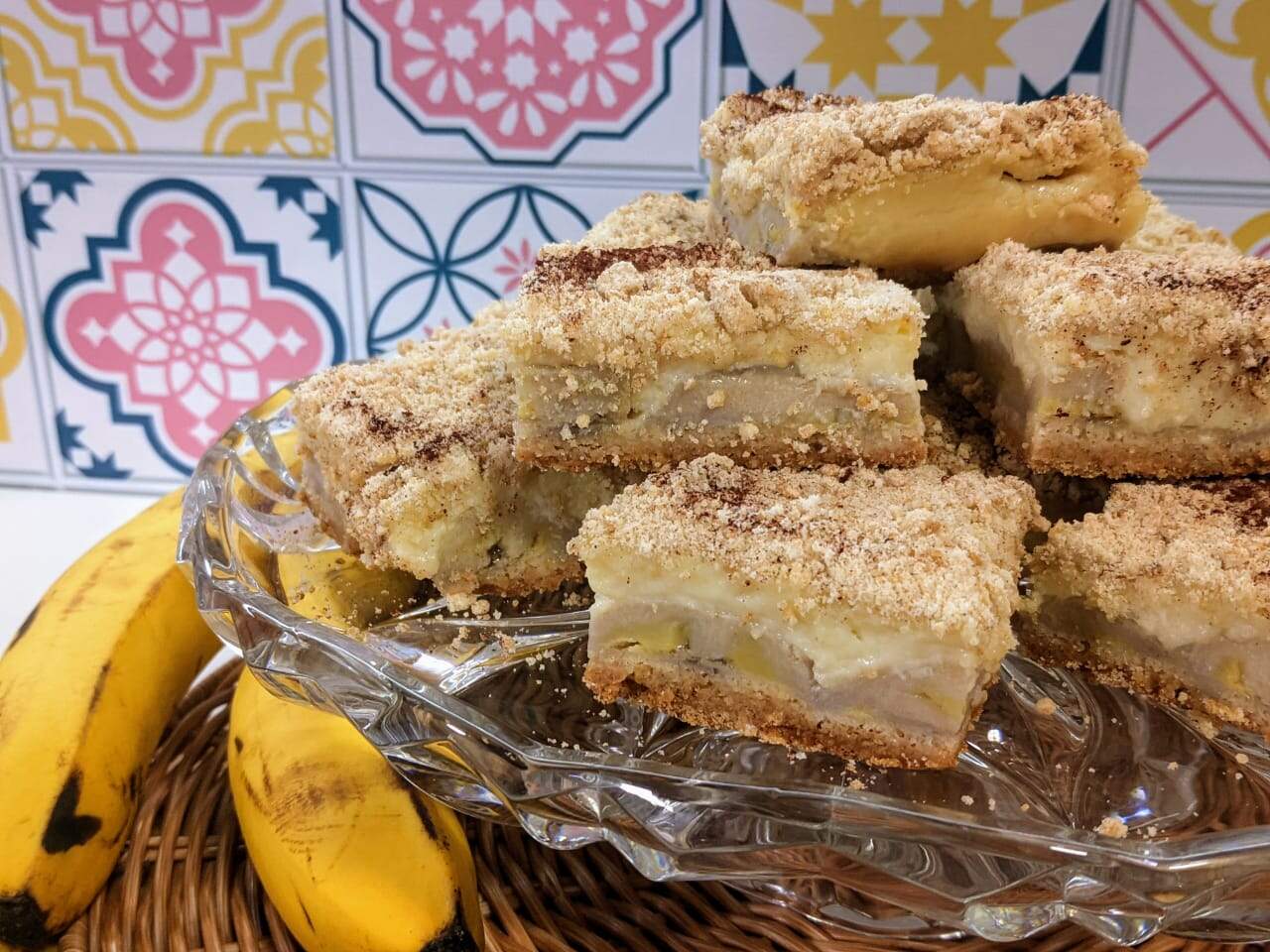 Montagem: em uma forma untada e enfarinhada, faça uma camada com um pouco mais da metade da farofa. Por cima, adicione as bananas cortadas em rodelas ou no sentido do comprimento. Se gostar, adicione nozes picadas e passas. Coloque o creme de leite condensado. Ponha o restante da farofa e polvilhe canela por cima. Leve ao forno preaquecido a 180ºc por 40 minutos. Pode comer quente ou gelada.