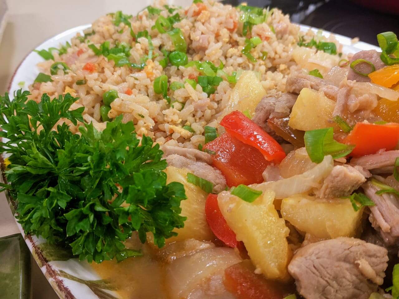 Em uma panela, coloque o óleo e refogue o alho, depois a cebola e em seguida a carne até ficar bem dourada. Coloque o pimentão e refogue por 5 minutos. Acrescente o abacaxi e refogue por 3 minutos e acrescente o molho e deixe ferver por 2 minutos.